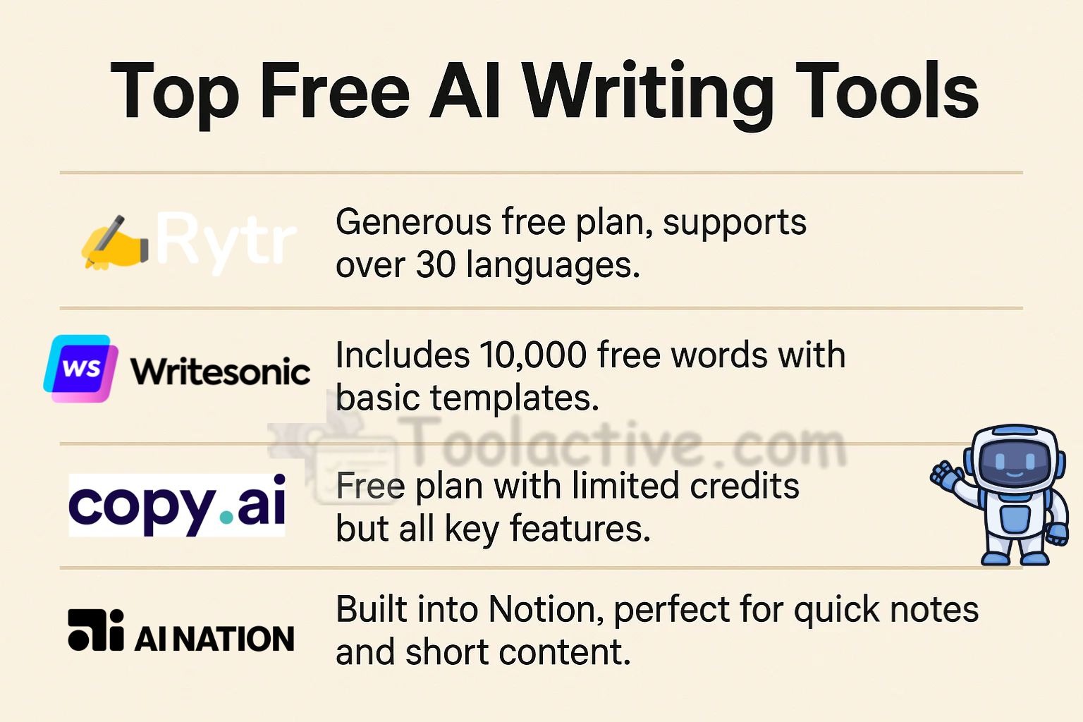 💡 Expert Tip: At ToolActive, we recommend testing multiple writing AI tools side-by-side for a week. Measure time saved, content quality, and SEO improvements before committing.