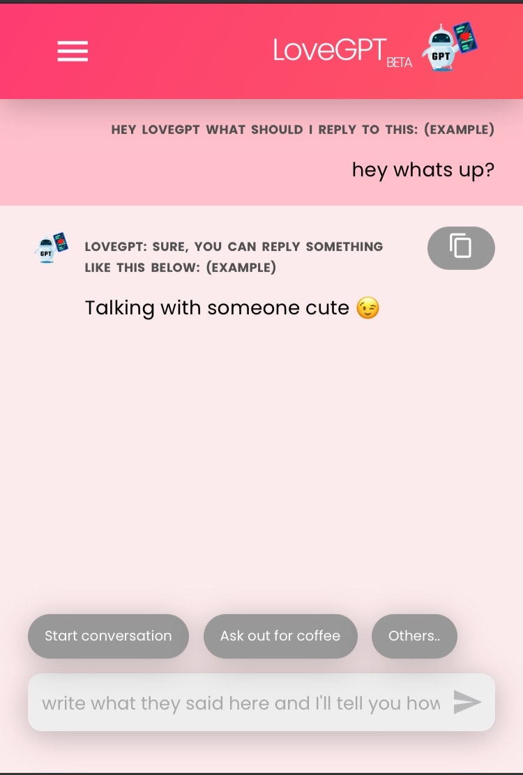 LoveGPT helps you with love conversations by generating thoughtful and engaging messages for you to send. Whether you're starting a conversation or keeping the dialogue going, this AI tool ensures you always have something interesting to say. It's a free service, making it accessible to anyone looking to enhance their communication skills in the dating world.